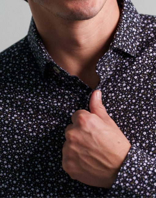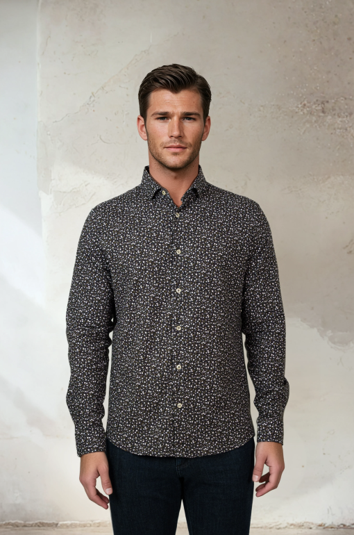 The NOVA – Dark Navy Meadow Ditsy Shirt from our Nova Collection is designed with an elegant drape and a smooth, peachy finish. Its clean silhouette and modern feel make it a versatile option for both casual and elevated looks.